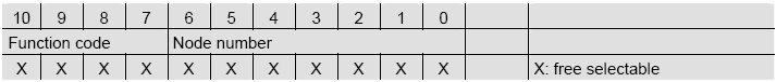 標識符COB-ID為11 bit(bin),其中: