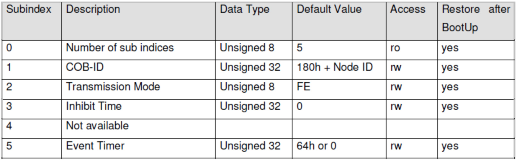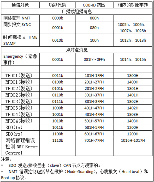 下表為可使用的Function Code,以及對應產生的標識符COB-ID: